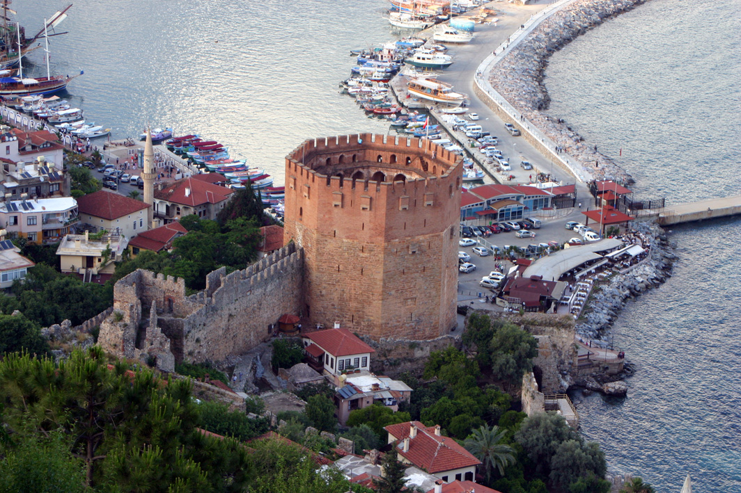 Один из символов Алании — башня Кызыл-Куле. Ее построили еще в 1226 году и по сей день она прекрасно сохранилась. Она использовалась как оборонительное сооружение, а сейчас здесь музей. В составе аланийской крепости башен много, но эта самая внушительная и крупная (высота стен до 34 метров).