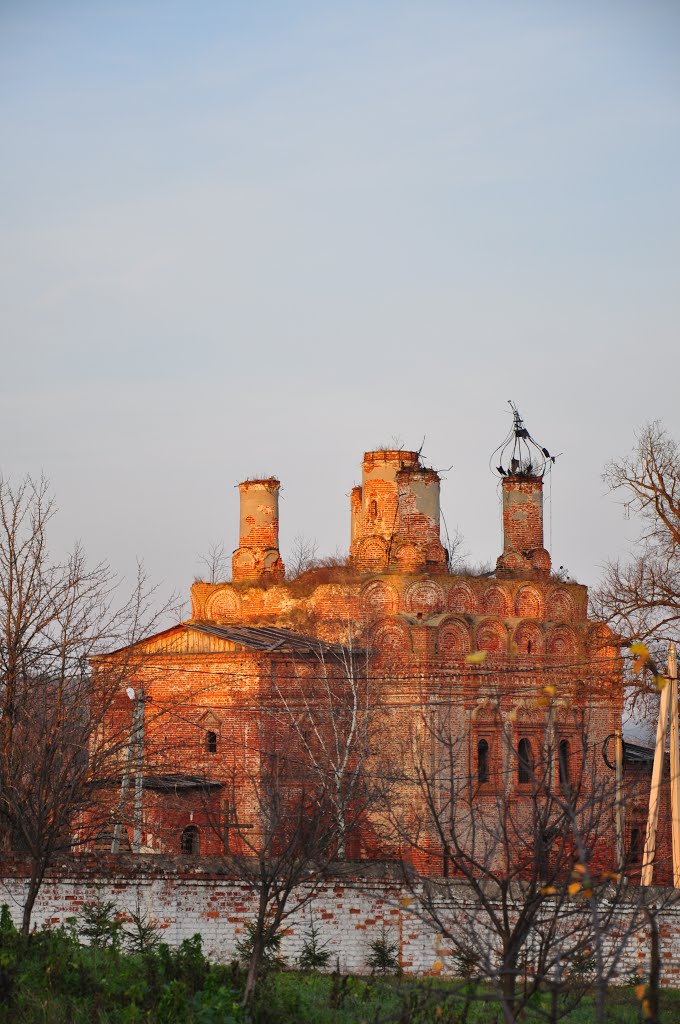 Рядом с ним возвышалась колокольня, соединяемая с основным зданием прямоугольной трапезной. Сегодня от величественного сооружения осталось немного: полуистлевший четверик с зияющими дырами на месте окон и дверей, корпус трапезной и нижний ярус колокольни. Внутри помещений сохранились остатки декора: ниши, стрельчатые своды, стёртые сандрики и пилястры.