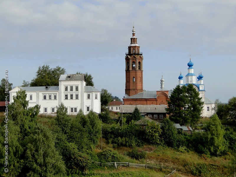 Сначала там стояла небольшая деревянная церковь, замененная на каменную в 1624 г. До наших дней сохранилась и восьмигранная колокольня. В монастыре находится уникальный иконостас (один из трех в России), выполненный мастерами Федоровыми. Колокольня и иконостас – отличительные черты мужского монастыря.