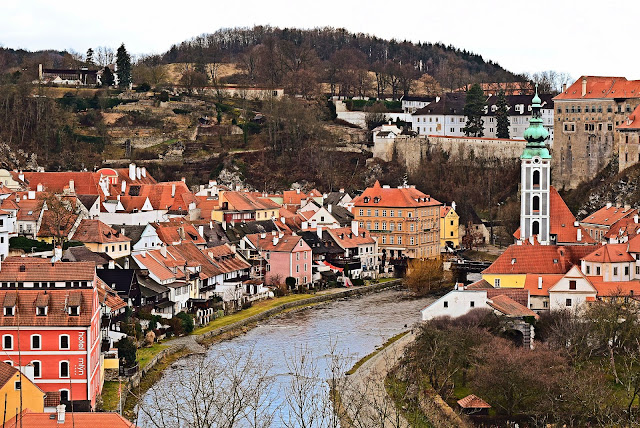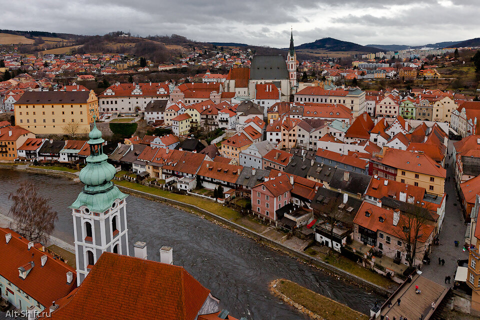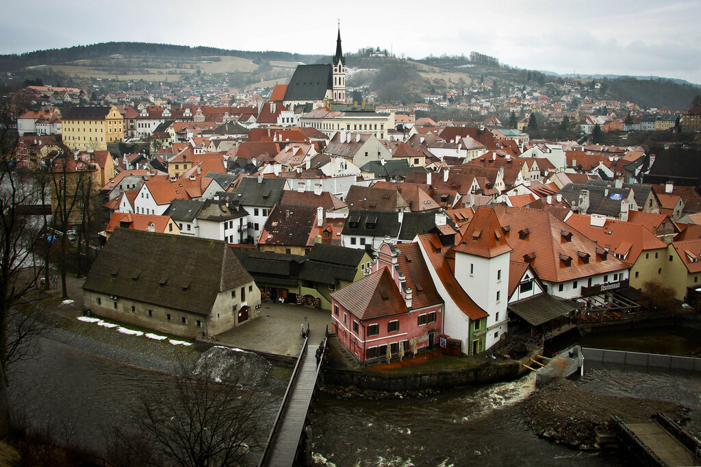 Таким образом, выехав в 8 утра из Праги, в Крумлов мы прибыли в 11:25. Это время оказалось идеальным для начала прогулки: уже успело потеплеть, и ночные -4 превратились в комфортные для прогулок +2. Был очень хороший свет для фото, чем мы воспользовались, начав снимать город с высоты на первой смотровой площадке недалеко от автовокзала в Крумлове. Исторический центр города очень компактный, и лучше всего любоваться на него с высоты. А самые красочные фото с домиками с черепичной крышей получаются со смотровых площадок.