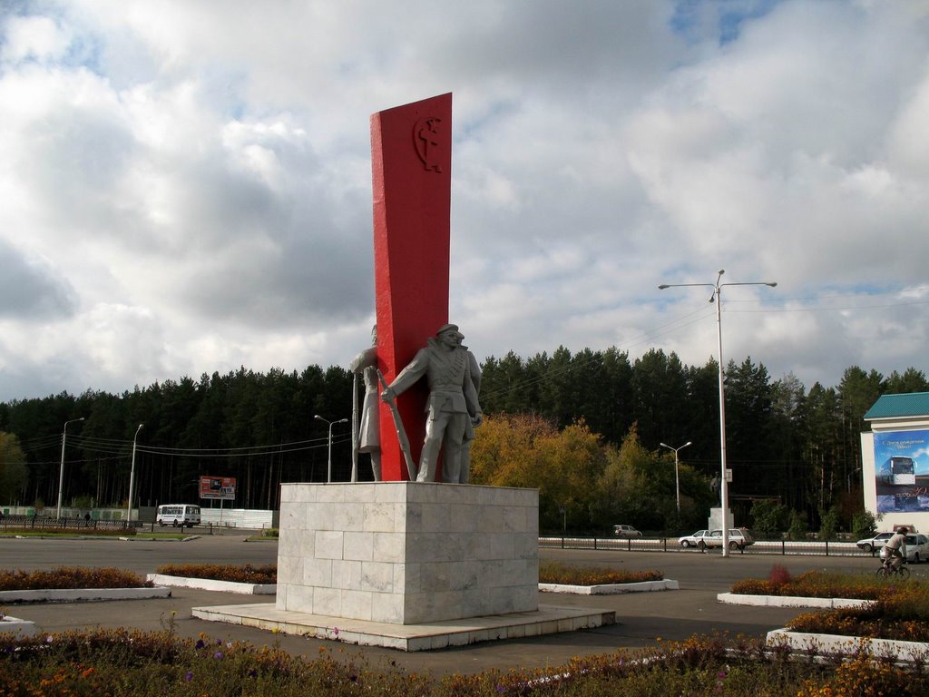 Монумент, изображающий бойца рабочего ополчения, революционных солдата и матроса, расположен на Юбилейном проспекте, перед зданием старого кинотеатра «Октябрь». Высота данной скульптурной композиции составляет 6 метров. За спинами трёх скульптур – красное стилизованное знамя из чугуна, с профилем Ленина с одной стороны, а также серпом и молотом – с другой.
