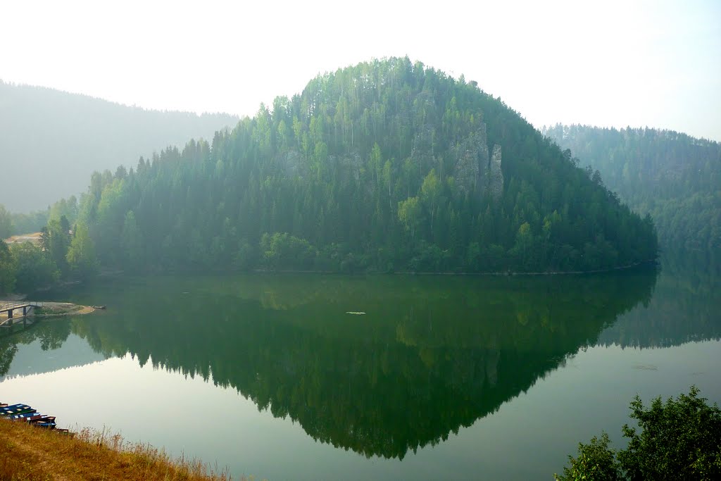 Как и любой технический пруд, созданный для обеспечения работы старых уральских железоделательных заводов, пруд был создан вместе с заводом в 1759 году в результате постройки плотины на реке Сим. Гладь воды, как подковой, окружена скалами, поросшими лесом, а в центре пруда возвышается живописная гора – Жукова Шишка. Названа она по фамилии священника Жукова, проводившего здесь когда-то богослужения.