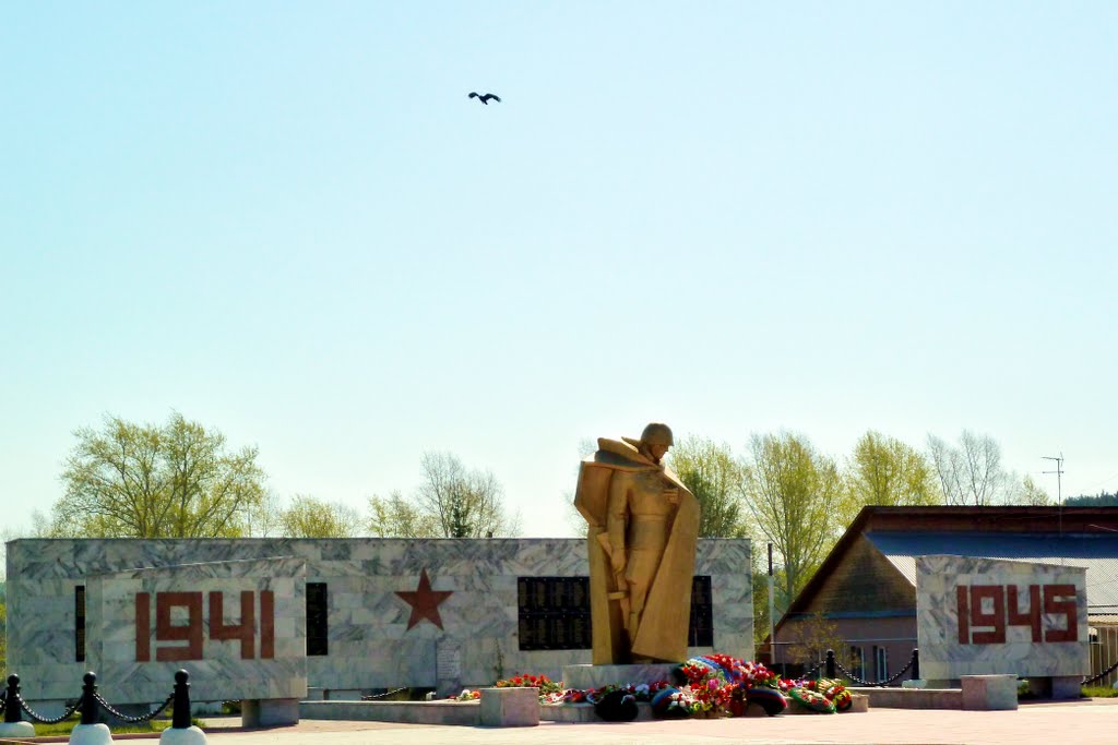 За спиной бойца расположена мраморная стена с траурно-чёрными плитами, на которых золотом выгравированы фамилии погибших в боях ВОВ сысертцев.
