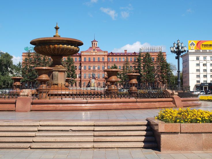 Бульвар приведет вас к памятнику землепроходцу Ерофею Хабарову, окруженному фонтанами, и железнодорожному вокзалу.