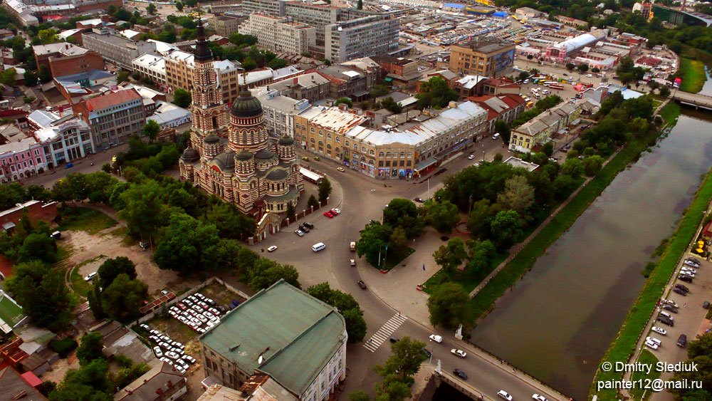Пятиглавый кафедральный Благовещенский собор поражает своим величием. Он выполнен в византийском стиле, со множеством декоративных элементов. Это древнейший храм города. Еще с 17 века на этом месте была деревянная церковь. Собор, который мы видим, возвели в 1907 году по проекту Михаила Ловцова, в последствии главного архитектора Харькова. Одновременно в храме может разместиться до 4 тысяч человек.