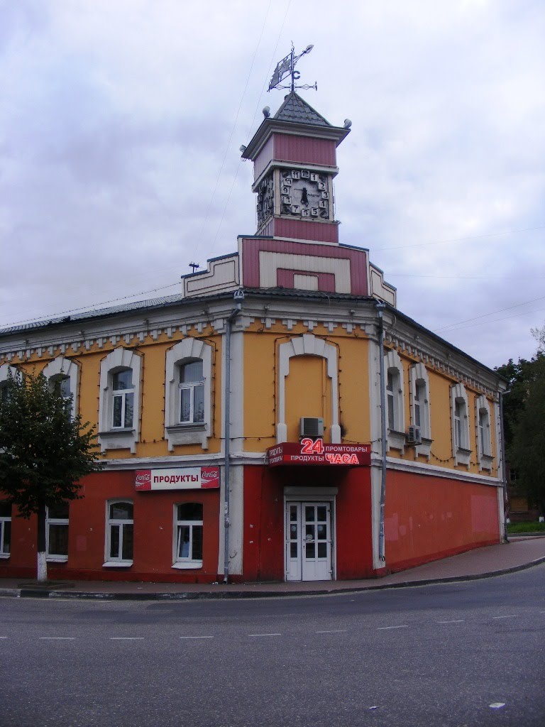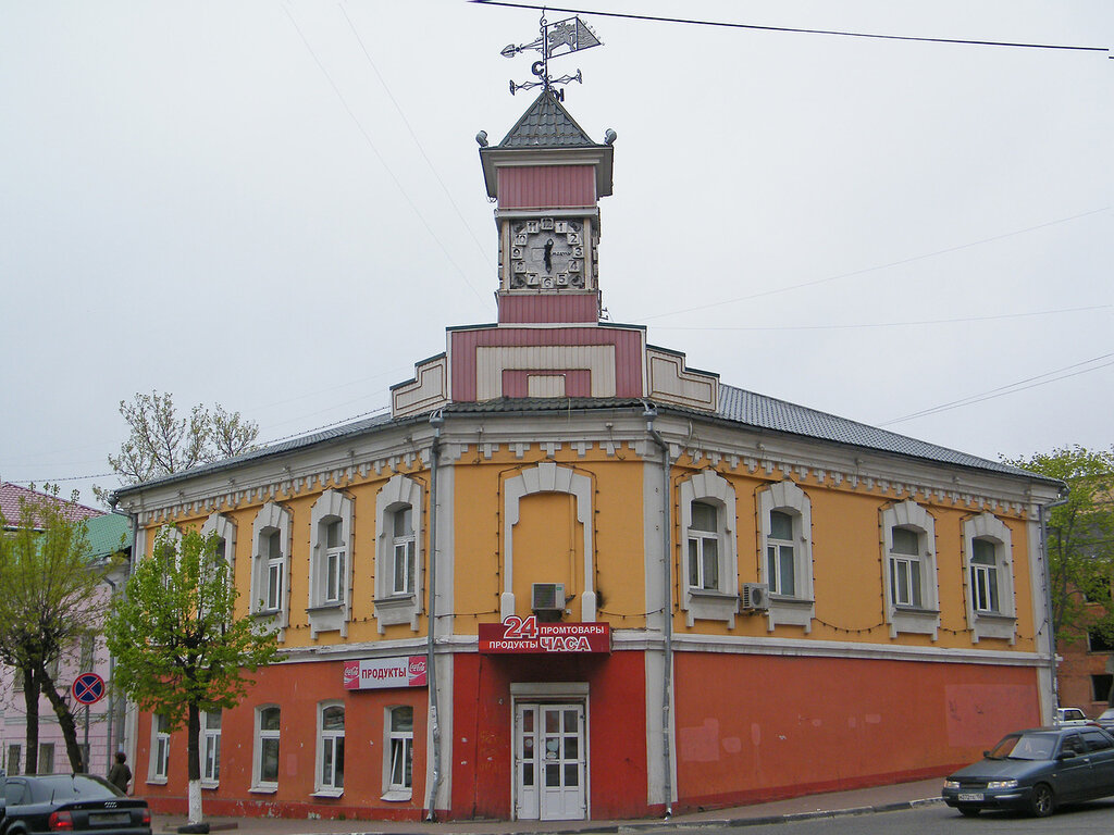 Двухэтажный угловой дом XIX столетия, над которым возвышается небольшая башенка с часами. Причем часы были установлены позже, в 1924 году, и на то время они были единственными в городе. До революции в здании размещались чайная и трактир. В 30-х годах – универмаг Торгсин. В послевоенное время дом перепланировали под коммунальные квартиры. С конца 70-х годов второй этаж занимает управление градостроительства, а на первом этаже сегодня открыт продуктовый магазин.