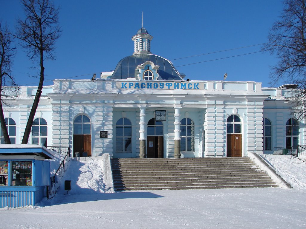 Для туристов, прибывших в Красноуфимск поездом, знакомство с городом начинается со здания вокзала. Оно было построено в 1915 году архитектором А.В. Щусевым.