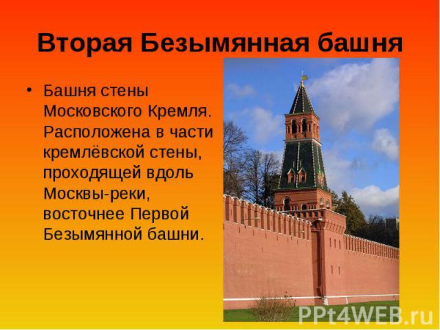 - Тайницкая башня была построена самой первой. Раньше через ворота башни был проложен потайной ход к Москва-реке, отсюда и ее название;