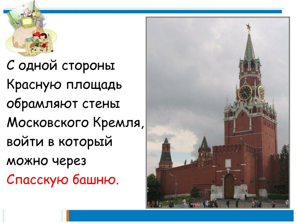 - Спасская башня, пожалуй, самая известная башня Московского Кремля, главный, парадный въезд, который открывается лишь по особым случаям. Своим фасадом башня выходит на Красную площадь. Спасскую башню узнают по установленным на ней часам-курантам, под бой которых вся Россия отмечает Новый год. Современные куранты появились здесь в середине XIX в.
