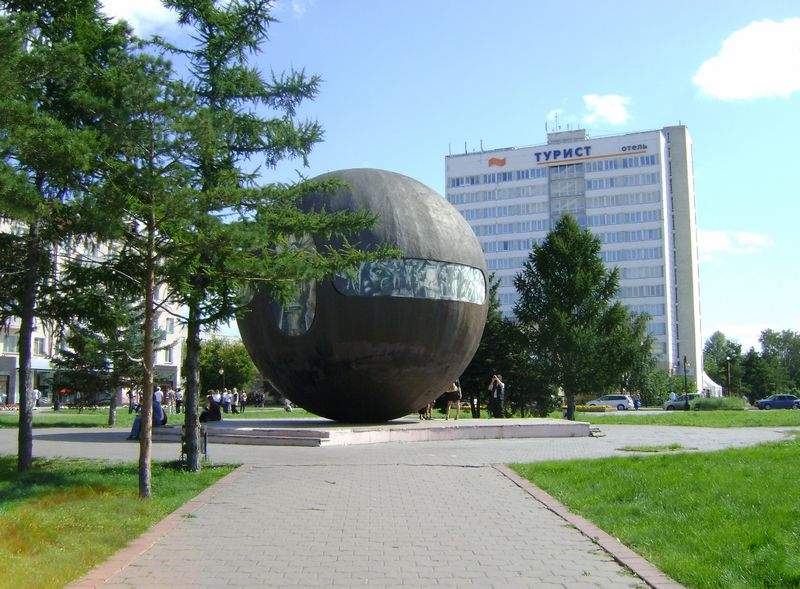 В центре находится современная скульптура «Держава», где изображены различные этапы освоения Сибири.