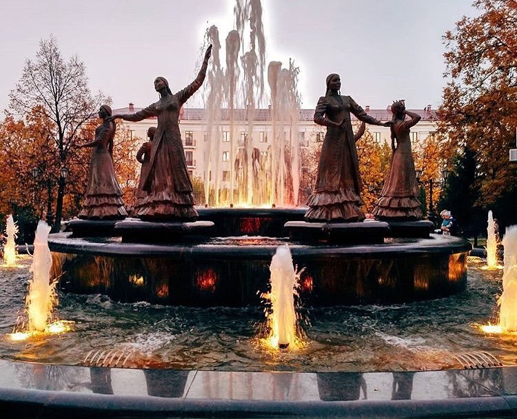 В центре 18-метровой чаши фонтана установлен круглый каменный постамент, по периметру которого установлены семь 2-метровых бронзовых статуй девушек в национальных костюмах. В основу композиции положена народная легенда, повествующая о семи девушках, которые когда-то бросились со скалы в воды реки Белой, чтобы не попасть в руки завоевателей.Национальный музей Республики Башкортостан — крупнейший музей Башкортостана и один из старейших музеев России, основан в 1864 году. Всего в музее 35 выставочных залов с археологической, этнографической, естественнонаучной и художественной коллекциями. посвященный истории народов, проживающих на территории Башкирии. Залы, посвященные природе Башкортостана, имитируют различные биологические среды. Одним из главных сокровищ музея является обширная нумизматическая коллекция, насчитывающая более 16 тысяч предметов. ул. Советская, д. 14, стр.