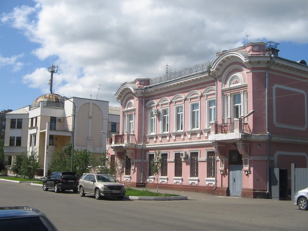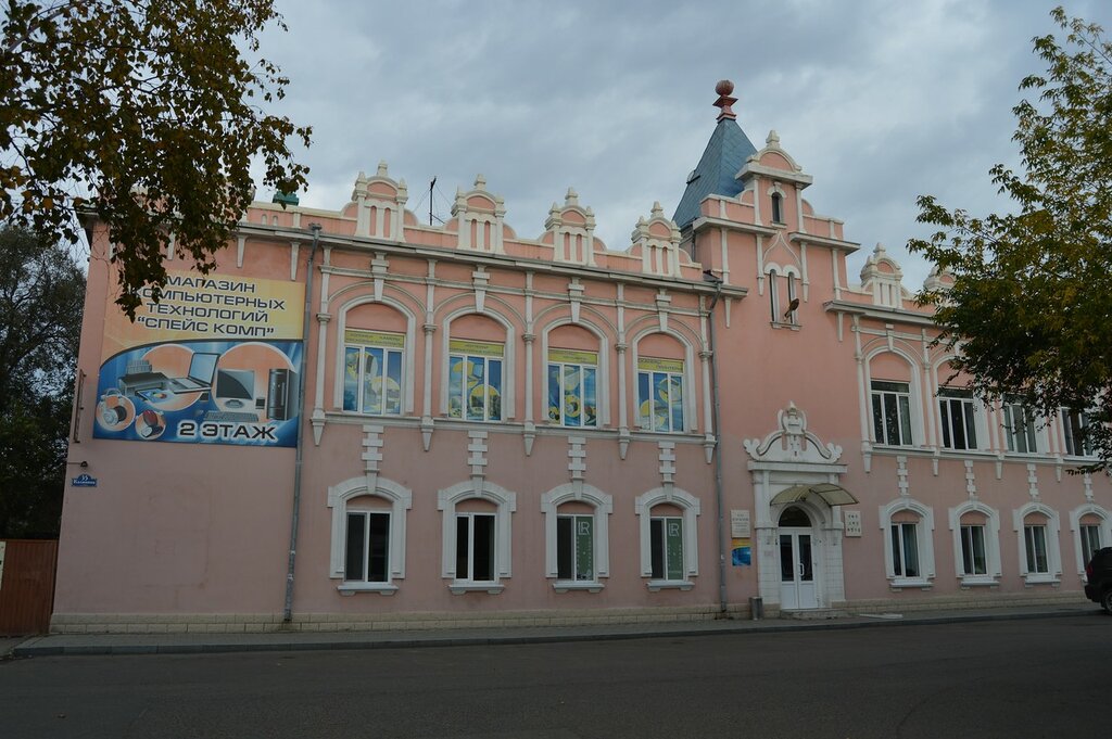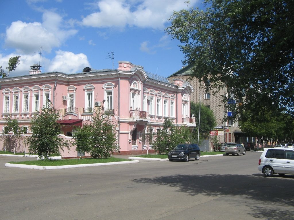 У элегантного особняка – подлинного украшения улицы Калинина, трудно не задержаться. В здании с розовым фасадом, напоминающим миниатюрный европейский замок, до революции располагалось Никольск – Уссурийское отделение главного банка Российской империи. Изящное сооружение роскошно декорировано.