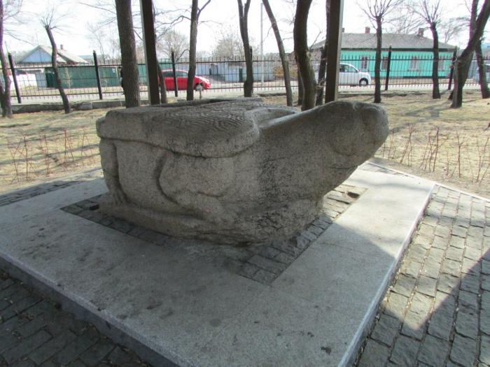 Во-вторых, некоторые историки считают, что скульптура животного – восточного символа долголетия, богатства, мудрости некогда украшала погребальный комплекс-курган великого полководца Пусянь Ваньну, возведенный много столетий назад в пределах нынешнего Уссурийска. Вес изваяния черепахи биси или, по-китайски – 赑屃, составляет более 6 тонн. Поверхность исторического памятника покрывает тончайшая, прекрасно сохранившаяся, резьба.