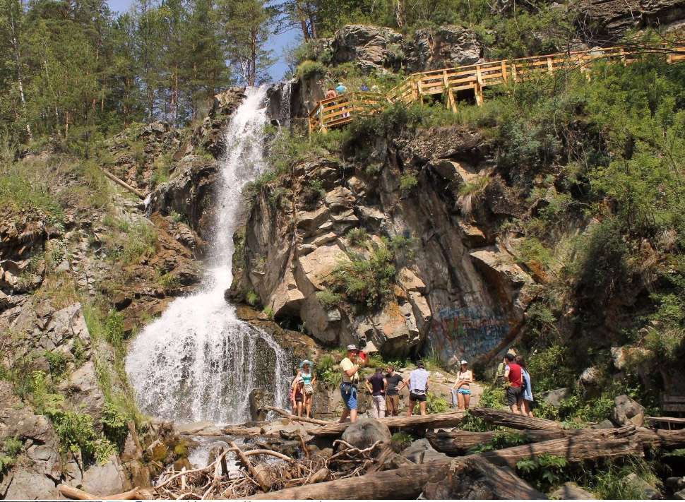 Образовался на реке Катунь в Шебалинском районе. Два каскада имеют высоту 12 м. К водопаду можно пройти разными тропами, и самая короткая дорога проложена через специальный мост от туристического комплекса «Царская охота». Проход платный, но позволяет лучше осмотреть округу. Внизу на камнях остались брёвна от старой водяной мельницы. Является региональным памятником природы.