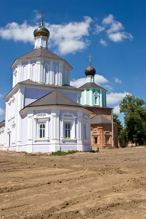 Когда-то в Рыльске Курской области насчитывалось до 20 церквей, сейчас остались три, действующих два храма – яркие достопримечательности Рыльска, вызывающие неподдельный интерес у приезжих гостей городка. В их архитектуре просматривается общая черта – угловые колонны колоколен сооружались группами по три, что характерно для зодчества XVII столетия. Высказывались предположения, что все они возводились одним неизвестным архитектором, очень талантливым и скорее всего местным.