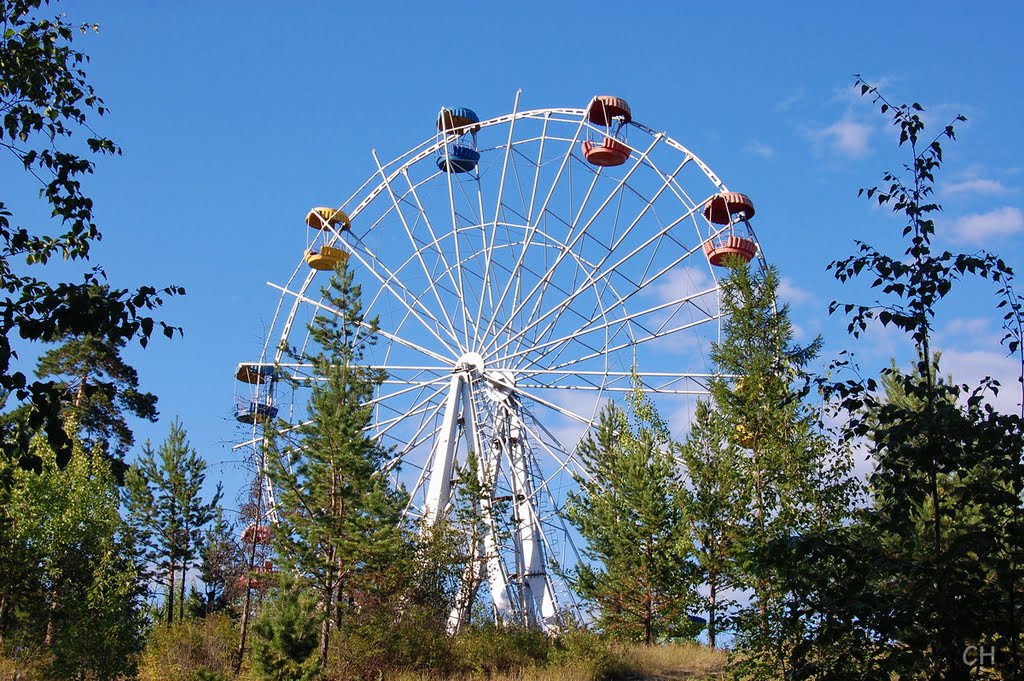 Городской парк в Северобайкальске, где проходят различные игры для детей, в окружении кедров и берез.