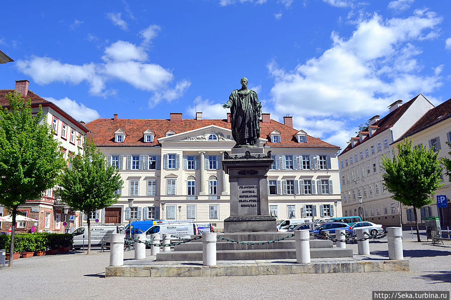 Вот и центральная площадь города, куда мы должны были приехать на трамвае, но решили идти пешком. Пока дошли начался дождь. Возглавляет площадь Фонтан Эрцгерцогу Штирии Иоганну Баптисту Австрийскому.