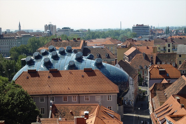 Вашей следующей остановкой будет Кунстхаус Грац , художественный музей. Даже если вы не увлекаетесь искусством, вам все равно стоит посетить это место. Почему? Потому что здание музея само по себе шедевр и стоит вашего внимания. Как и Муринзель, Кунстхаус был частью празднования Культурной столицы Европы в 2003 году.