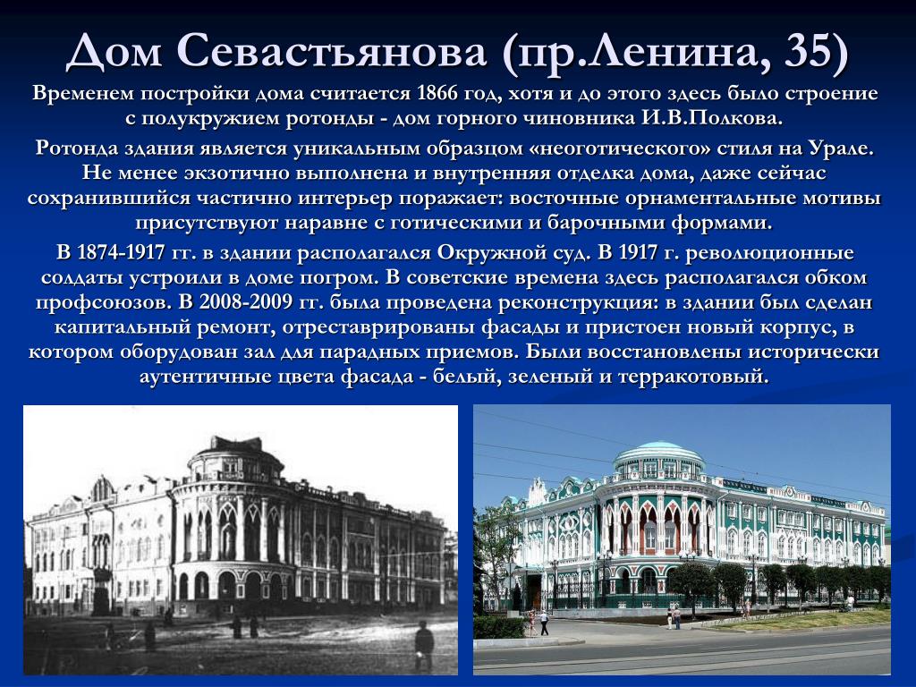 Дом Севастьянова — дом уральского предпринимателя Николая Ивановича Севастьянова является единственным образцом готическо-мавританского архитектурного стиля в Урало-Сибирском регионе.