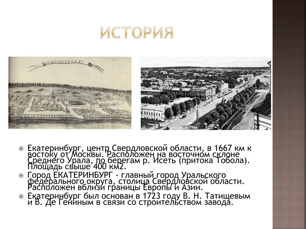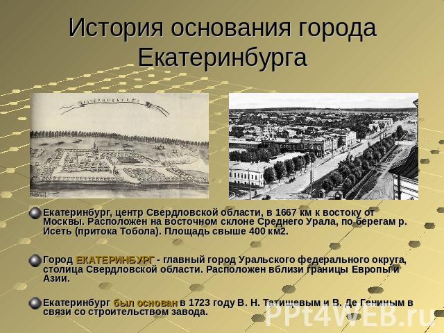 История города Екатеринбурга началась в XVIII веке. В 1721 году Петр I Великий издал указ, на основании которого Татищев Василий Никитич на реке Исеть начал строительство металлургического завода. Уже 18 ноября 1723 года завод был не только построен, но и выдал первую продукцию. Эту дату решили считать днем основания города. В основном города России называются в честь кого-нибудь, либо в честь чего-нибудь.
