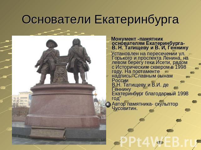 Екатеринбург — город театральных и культурных традиций. Здесь действуют консерватория и филармония, театр оперы и балета, драматический театр и театр юного зрителя. В Екатеринбурге можно встретить множество памятников, посвященных людям, чьи жизнь и творчество оказались связаны с этим городом. Среди них особого внимания заслуживают памятники основателю Екатеринбурга В.