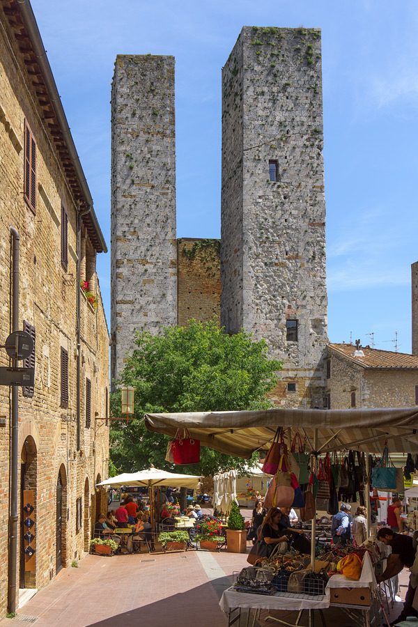 За углом от площади Пьяцца дель Дуомо находится площадь Пьяцца. делле Эрбе, где вы найдете небольшой рынок и еще две высокие башни — Torri dei Salvucci. Семья Сальвуччи построила эти башни, чтобы продемонстрировать превосходство над мэром Сан-Джиминьяно того времени, которому принадлежала Торре Роньоза.