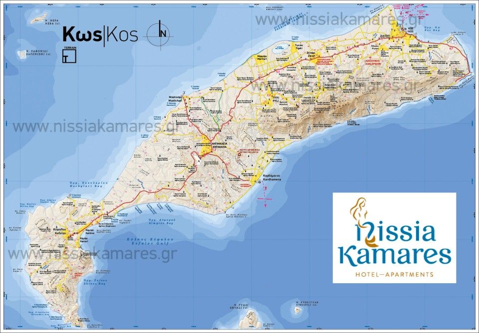 Курорты острова: Кефалос, Мастихари, Мармари, Кардамена, Псалиди, Агиос-Фокас. Рядом соседние острова острова Кос архипелага Додеканес, на которые можно совершить поездку — Псеримос, Калимнос и Нисирос.