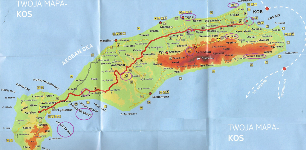 От Асклепийона можно поехать вглубь острова. На Вашем пути встретится живописный город Асфендиу, а из находящегося на склоне горе Диктео селения Зия открывается вид на весь Кос, окружающие его острова и побережье Турции.