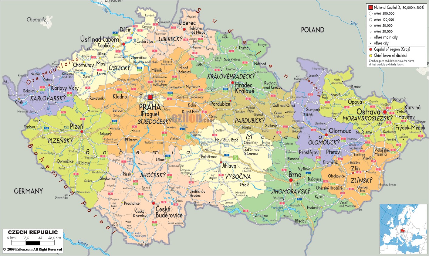 Чехия включает в себя следующие исторические области: Моравию (восток), Богемию (центр) и часть Силезии (северо-восток).