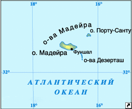 Острова Мадейра и Порту-Санту и необитаемые острова Селважинш (Дикие) и Дезерташ (Пустынные) образуют архипелаг Мадейра , открытый португальцами в 1418 году. Архипелаг Мадейра находится в Атлантическом океане на расстоянии 500 км от Африки и 1000 км от европейского континента.