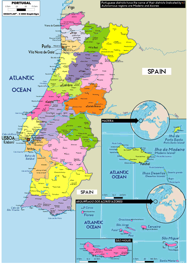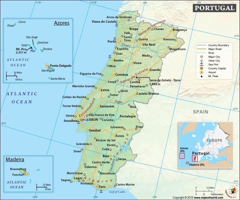 В состав ее территории также входят находящиеся в Атлантическом океане Азорские острова и архипелаг Мадейра. Португалия граничит на севере и востоке только с одним сухопутным соседом – Испанией. Юг и запад государства омывает своими водами Атлантический океан. Общая площадь Португальской Республики вместе с отдельно расположенными островами составляет 92 тысячи кв. км.