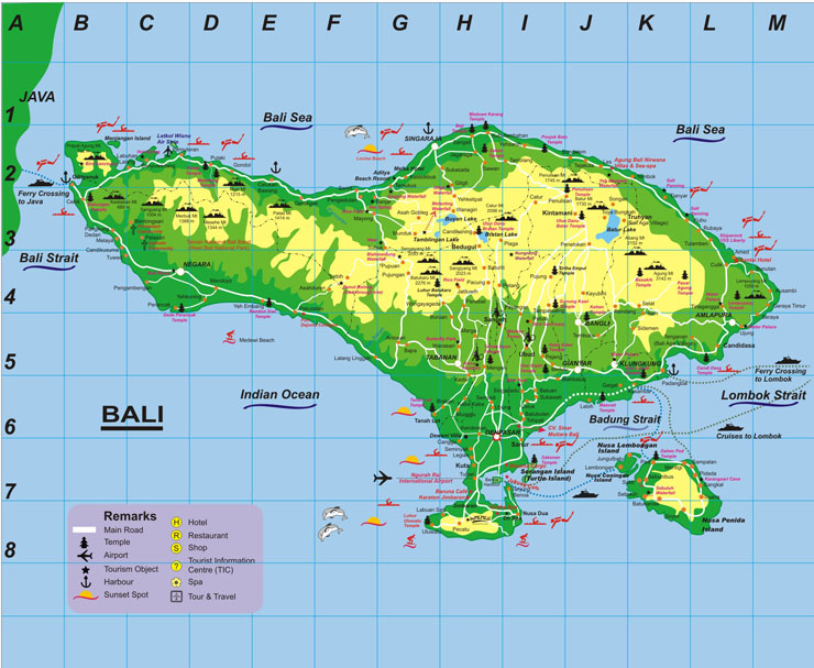 Отправляясь в Индонезию Бали, карту которой вам стоит просмотреть еще до начала поездки, надо распланировать свое путешествие заранее. Ведь изучая карту острова Бали, вы удивитесь огромному количеству мест для разнообразного отдыха: начиная от познавательного и вальяжного и заканчивая экзотическим и экстремальным. Вся карта острова Бали просто усыпана городами и поселками, которые непременно захочется посетить. На Бали карте легко можно увидеть, что основных городов для отдыха насчитывается 14.