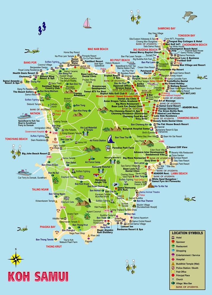 На ней указаны даже поля для гольфа, где профессиональные тренеры дают уроки новичкам. Увидев пирсы Самуи на карте, вы получите представление о том, где находитесь и куда отправиться, только сойдя с парома.