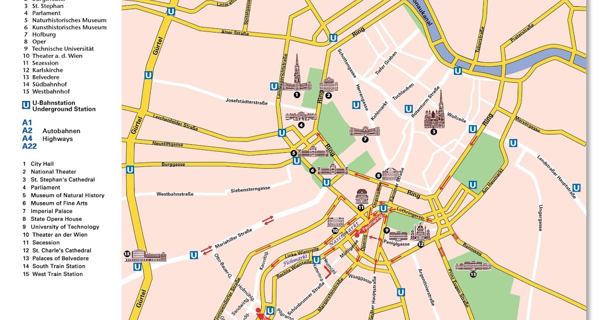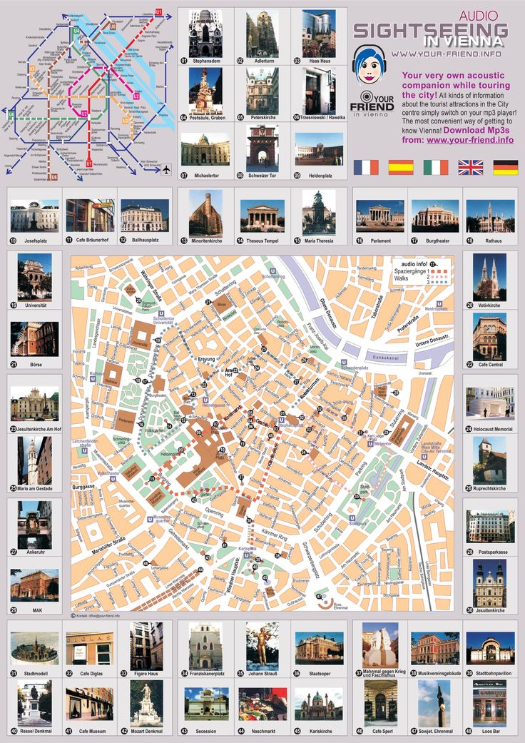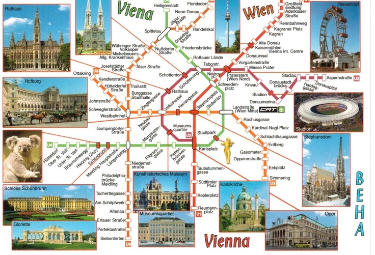 Туристическая информация о таких достопримечательностях, как императорский дворец Хофбург, Испанская школа верховой езды, церковь Св. Карла, Венская государственная опера, Собор Св. Стефана, Альбертина, Художественно-исторический музей, Ратуша, Дворец Шенбрунн, Тиргартен Шенбрунн, Бургтеатр, Городской парк, Музей естественной истории Музей, здание австрийского парламента, Венский Сецессион, Пратер, Винер Ризенрад, Дунайская башня, Шопрон, Братислава и другие.