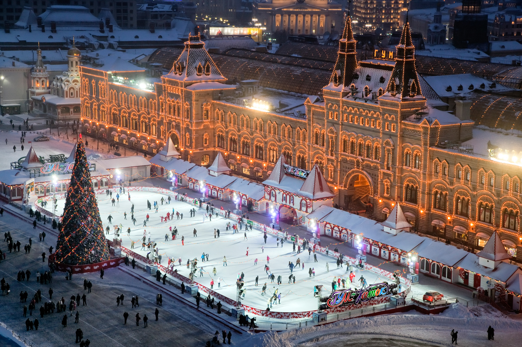Зимой главная площадь страны окутана особым очарованием, поскольку перед ГУМом заливают каток.