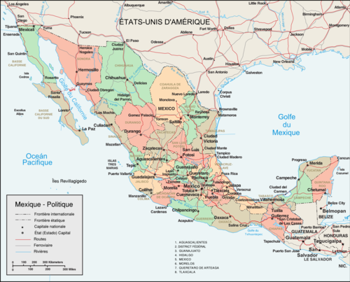 Агуаскальентес, Нижняя Калифорния, Южная Нижняя Калифорния, Кампече, Чьяпас, Чиуауа, Коауила, Колима, Дуранго, Гуанахуато, Герреро, Идальго, Халиско, Мексика, Мичоакан, Морелос, Наярит, Нуэво-Леон, Оахака, Пуэбла , Керетаро, Кинтана-Роо, Сан-Луис-Потоси, Синалоа, Сонора, Табаско, Тамаулипас, Тласкала, Веракрус, Юкатан и Сакатекас. Федеральный округ (территория, включающая Мехико и его окрестности) является федеральным округом.