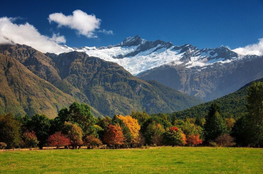 В середине Южного острова находится уголок природы с заснеженными вершинами, среди которых гора Кука высотой 3754 метра, ледниками, в том числе Тасманом — самым большим в Новой Зеландии, лесами и быстрыми горными реками. В Маунт-Кук можно заняться альпинизмом, рыбалкой, просто прогуляться семьей к ближайшему озеру.
