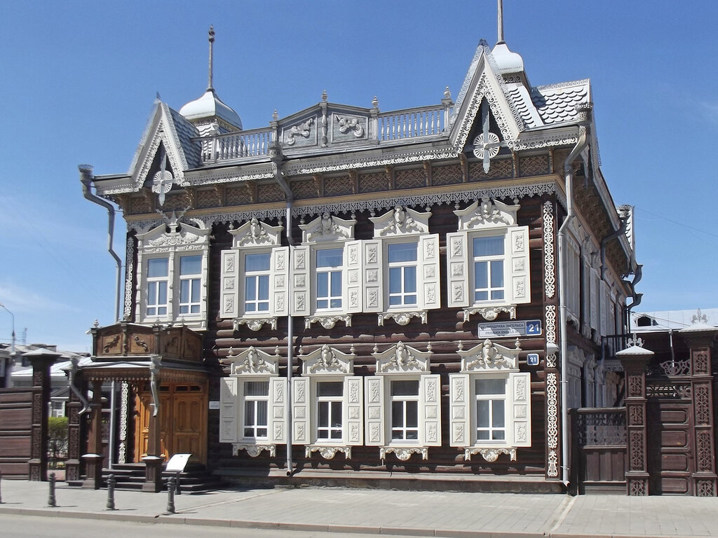 Живописный деревянный особняк, увитый резьбой, словно белым кружевом, – истинный шедевр деревянной архитектуры. Его нарядные наличники и карнизы тончайшей паутиной покрывают фасад и создают ощущение воздушности.