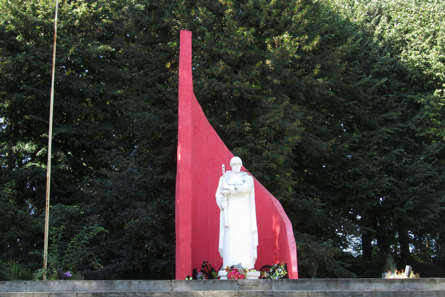 Ухоженный и оформленный комплекс дополняется скульптурным изображением солдата и надписью, содержащей стихотворные строки: