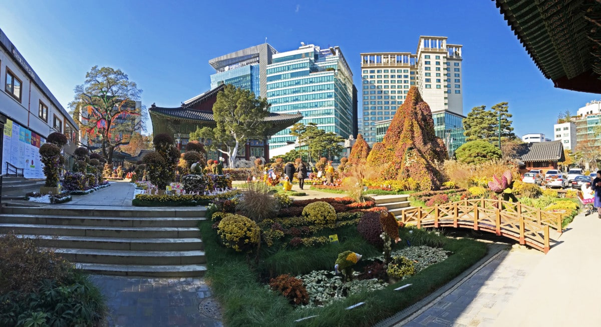 Буддийский храм Чогеса находится в центре Сеула в окружении высотных зданий. Территория храма совсем небольшая, но очень колоритная. Когда я туда пришла, подумала, что попала в цветочный рай. У храма корейцы разбили множество ярких клумб, сделали дракона из живых цветов и организовали выставку бонсай — живых деревьев в миниатюре.
