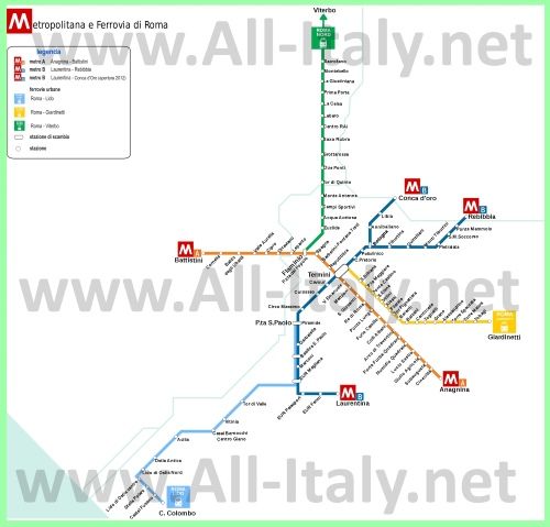 - МА — Linea A: Anagnina-Battistini. Самая популярная и загруженная ветка римского метрополитена обозначается на схемах метро оранжевым цветов. Была открыта в 1980 году и насчитывает 27 станций. Рядового туриста, обычно, интересует всего несколько станция от вокзала Термини до Ватикана.