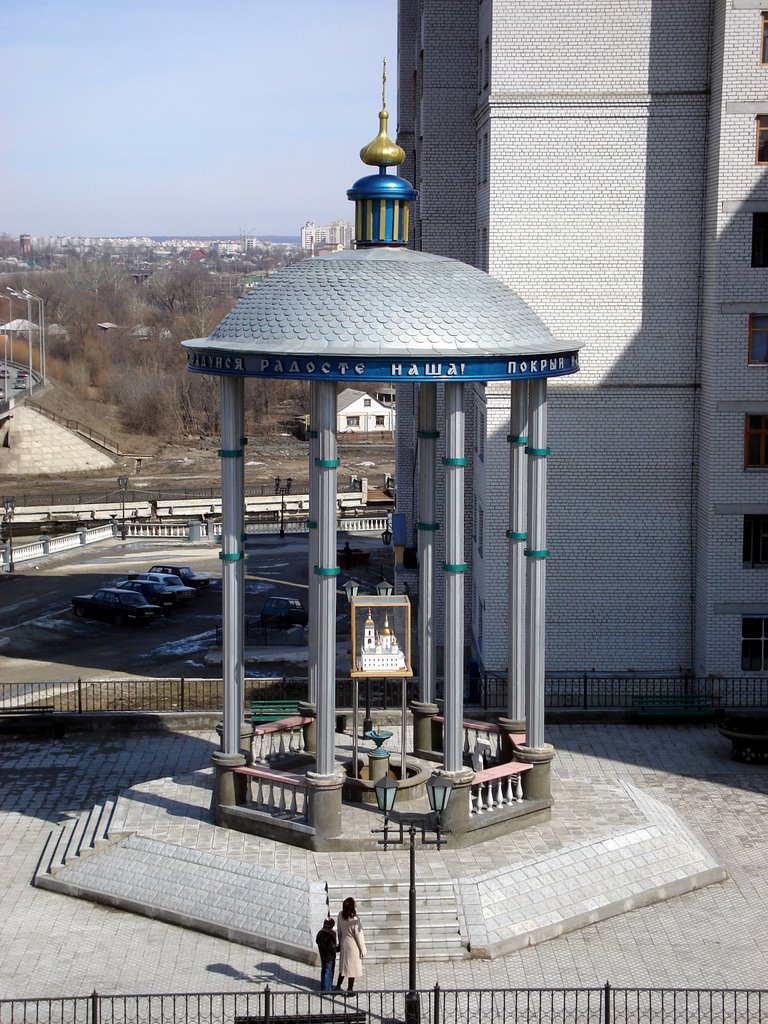 34.Памятник тут установили в 2005 году. На нем ротонда, на ней маленький крест, расположенный на куполе. У памятника высокие колонны, между которыми располагаются перила. В центре располагается куб из стекла, в котором находится макет церкви в том виде, в котором она выглядела к моменту разрушения.